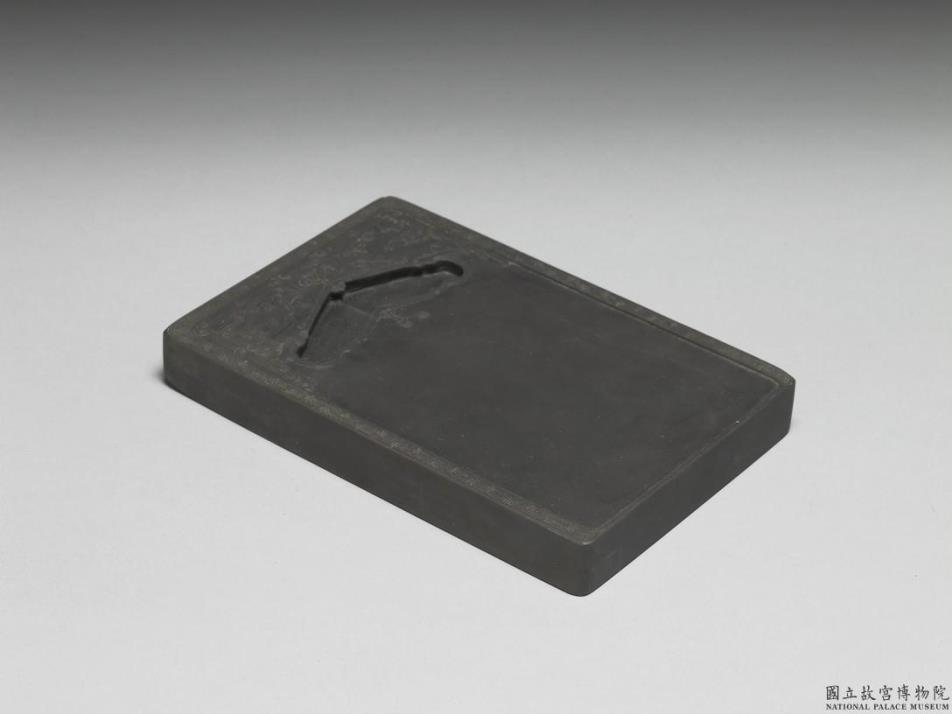 长方形砚,砚面四周起边框,阴刻回纹。砚堂平整,一端浮雕蝙蝠衔磬图案,磬旁饰双龙首图案,整体寓有「福庆」之吉祥意涵,磬身凹陷成墨池。砚背浮雕一跪坐石上之鹿,一猴手捧寿桃坐于桃树下方,树旁数株灵芝,空中有一飞鸟。整体装饰具有「福、禄、封侯」之吉祥意涵。砚色有黑中泛紫,带一紫檀砚盒。