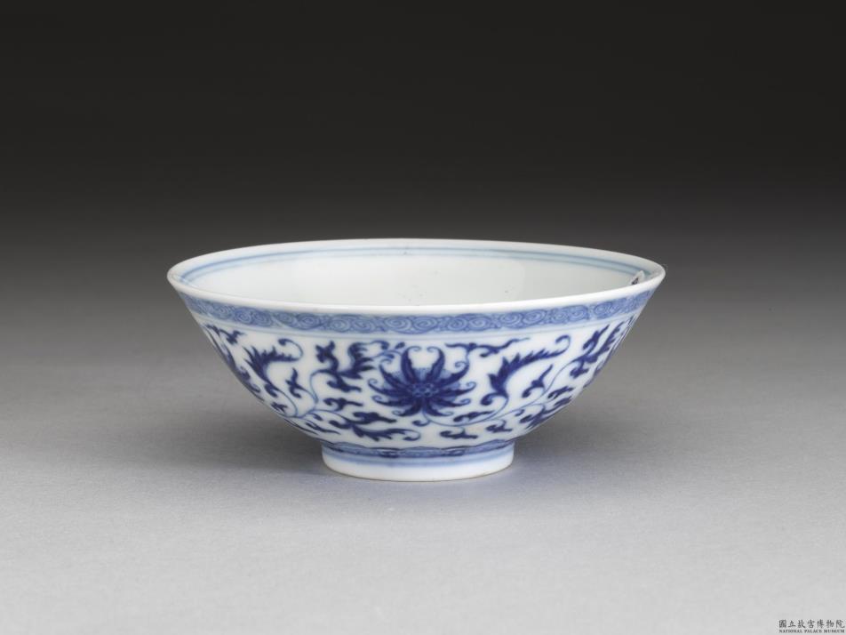 敞口,深壁,矮圈足。外壁画番莲五朵,口沿画卷草纹一周,底边画如意云纹一周,口足间加饰青线五道。碗内口沿画双线,底心画番莲一朵,边加双线。底有青花书「大清乾隆年制」三行六字篆款。