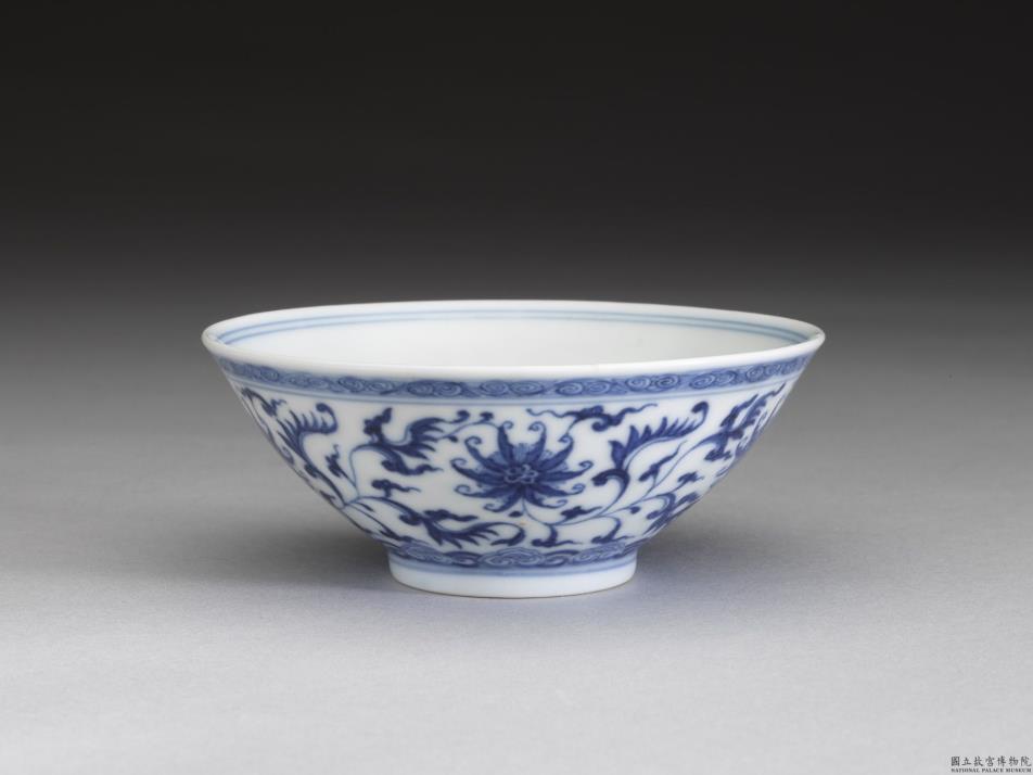 敞口,深壁,矮圈足。外壁画番莲五朵,口沿画卷草纹一周,底边画如意云纹一周,口足间加饰青线五道。碗内口沿画双线,底心画番莲一朵,边加双线。底有青花书「大清乾隆年制」三行六字篆款。