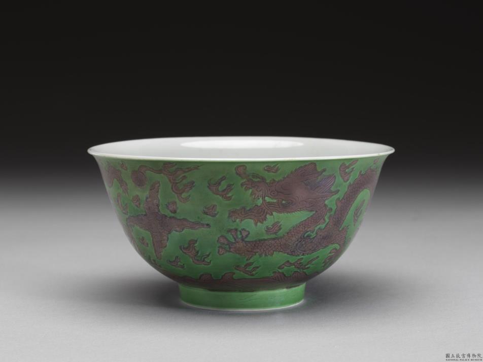 侈口微撇,深壁,矮圈足。外壁以绿釉为地,赭彩绘双龙戏珠,隙间画云纹和火焰纹,底沿绘波涛纹一周。内壁纯白,无纹饰。底有青花书「大清乾隆年制」三行六字篆款。