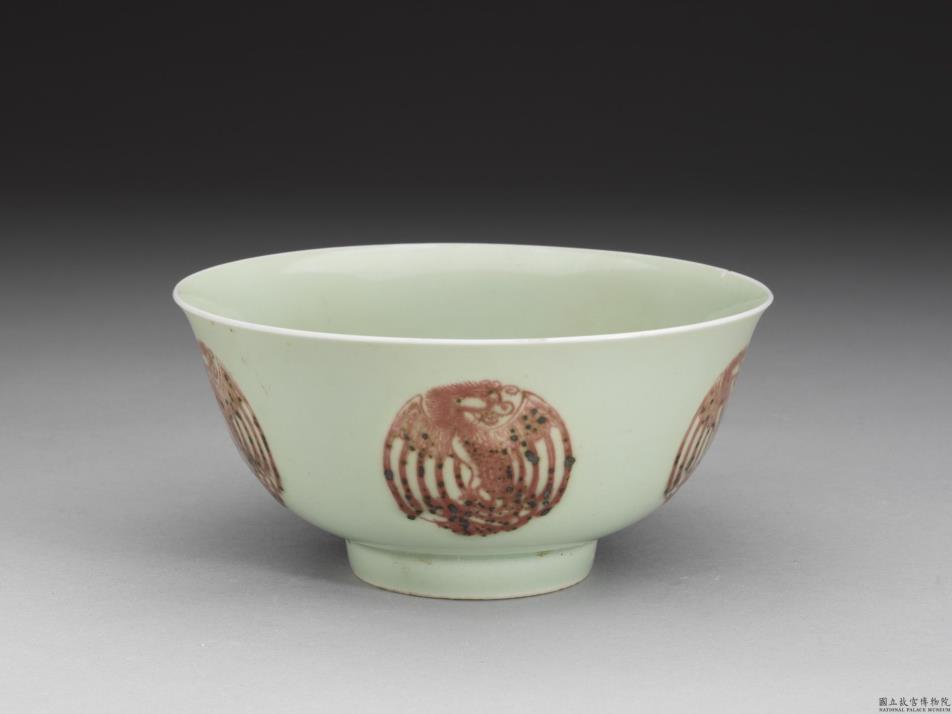 圆口,唇缘微外侈,弧形深壁,平底,矮圈足。器壁通施冬青釉,釉色呈粉绿。外壁装饰五个釉里红团凤纹,碗心亦绘一团凤纹,凤首、躯体与凤尾成S型,双翅展开于两侧,使图案成圆形,红釉发色呈暗红色,带绿色苔点。底有青花书「大清雍正年制」二行六字楷款,外加双圈。