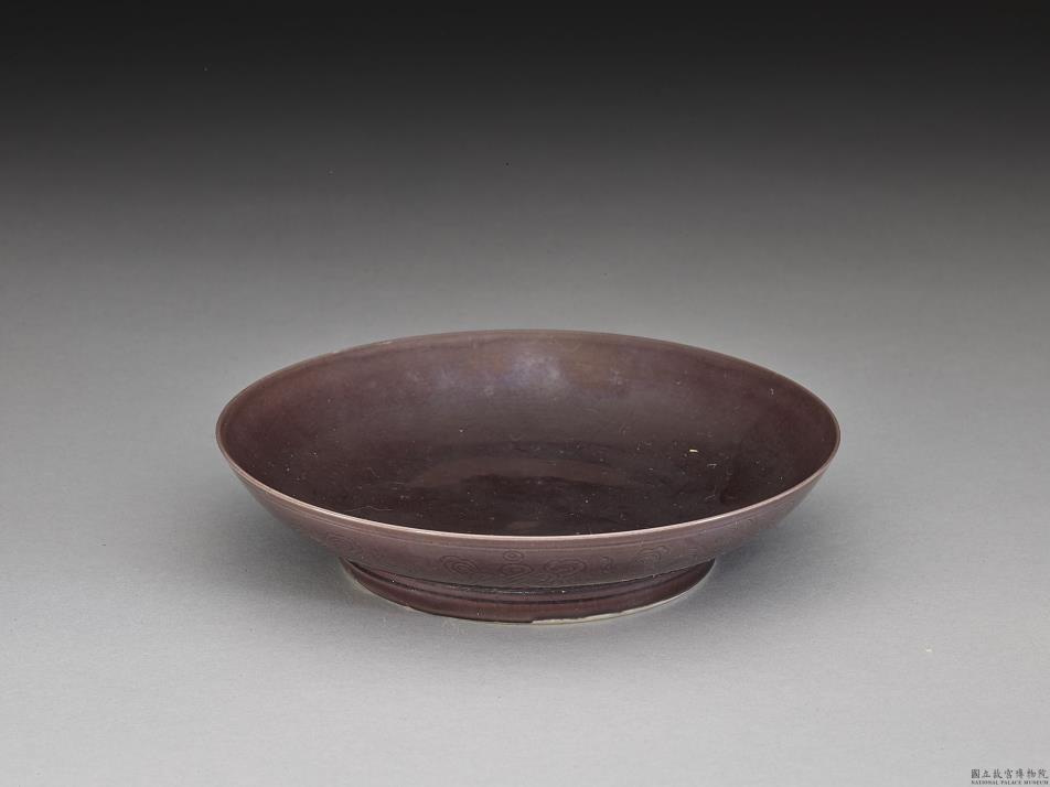 侈口、浅弧壁、矮圈足,施茄皮紫釉,外壁刻划八宝纹一周,内壁无纹饰。圈足露胎,足底施白釉,有青花书「大清雍正年制」二行六字楷款,外加双圈。