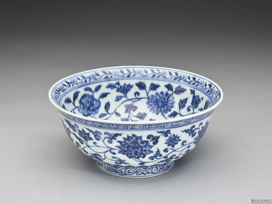 口微撇,深壁,矮圈足。薄胎白釉,内口沿画青花转枝小菊花一周,碗内底画番莲一枝,内壁画青花缠枝牡丹、菊花等四季花卉五朵,外壁画缠枝番莲五朵;外口沿画回纹一周,底边画莲瓣纹,足圈有卷草纹。各纹饰间有青花弦纹相区隔。足圈露胎,圈足内底施白釉,并书「大明宣德年制」六字双行双圈青花楷书。