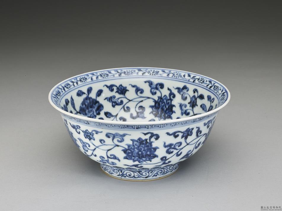 口微撇,深壁,矮圈足。薄胎白釉,内口沿画青花转枝小菊花一周,碗内底画番莲一枝,内壁画青花缠枝牡丹、菊花等四季花卉五朵,外壁画缠枝番莲五朵;外口沿画回纹一周,底边画莲瓣纹,足圈有卷草纹。各纹饰间有青花弦纹相区隔。足圈露胎,圈足内底施白釉,并书「大明宣德年制」六字双行双圈青花楷书。