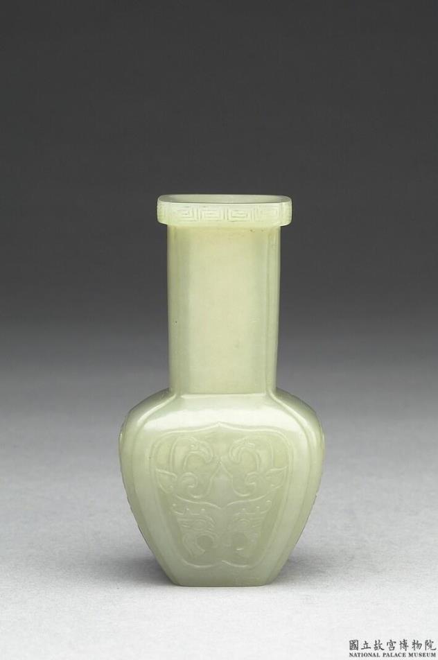 青白玉,玉色泛青灰。全器作方形,直长颈、鼓腹,器腹上宽下狭无足。口沿有回纹一周,腹部饰带高角的兽面纹。