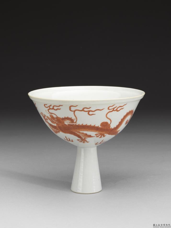 侈口窄唇,唇缘细棱凸起,深壁,高圈足,施白釉。外壁以红彩描绘双龙戏珠与火焰纹,碗心书「大清乾隆年制」三行六字篆款,外加双方框。