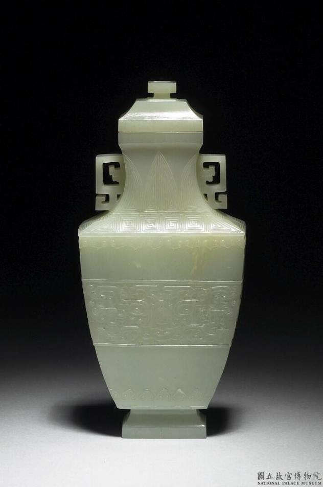 白玉,玉色泛青,有白斑。全器作方形。有盖、长颈、折肩、敛腹、有圈足。颈边有二耳,作立雕回纹。颈部浅浮雕回纹与三角叶纹,腹部有兽面纹,以回纹为地。腹部上下缘则饰如意卷云纹。