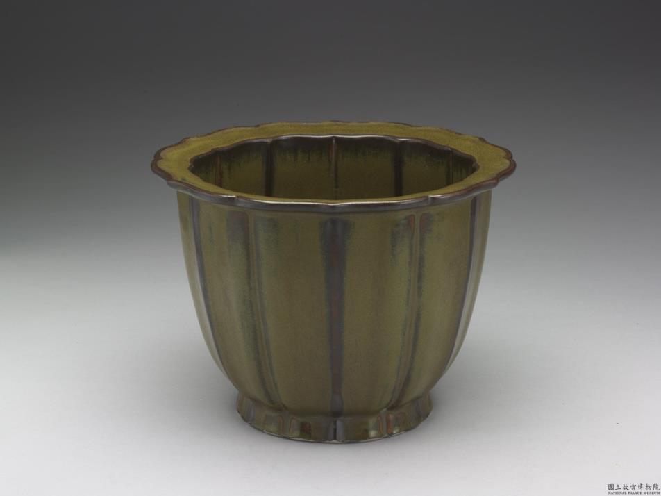 器型仿明代钧窑六瓣莲花式花盆,口沿外翻,莲瓣式矮圈足,足底露白胎,器底阴文「雍正年制」篆书印款,镂四圆型渗水孔。黄绿茶叶末釉,釉表呈橘皮状细孔,器身出棱处呈深褐色。白泥抵渗水孔,可种水性植物或作假花盆景。清乾隆甲子年(九年,1744)冷枚仿仇英〈汉宫春晓〉卷(故画01717),石案上,藕香色葵花式花盆栽植盛开的水仙。据明崇祯癸末(1643)方以智〈物理小识〉记载,种植水仙的方式:「十月盆栽沙石水养,不用泥土」。可见不带渗水孔的花盆,适合种植水仙。又清汪承霈(?-1805)〈万年花甲〉(故画01703)则画青瓷莲花式花盆种植粉色茶花,显示清人对同类花器的灵活运用。