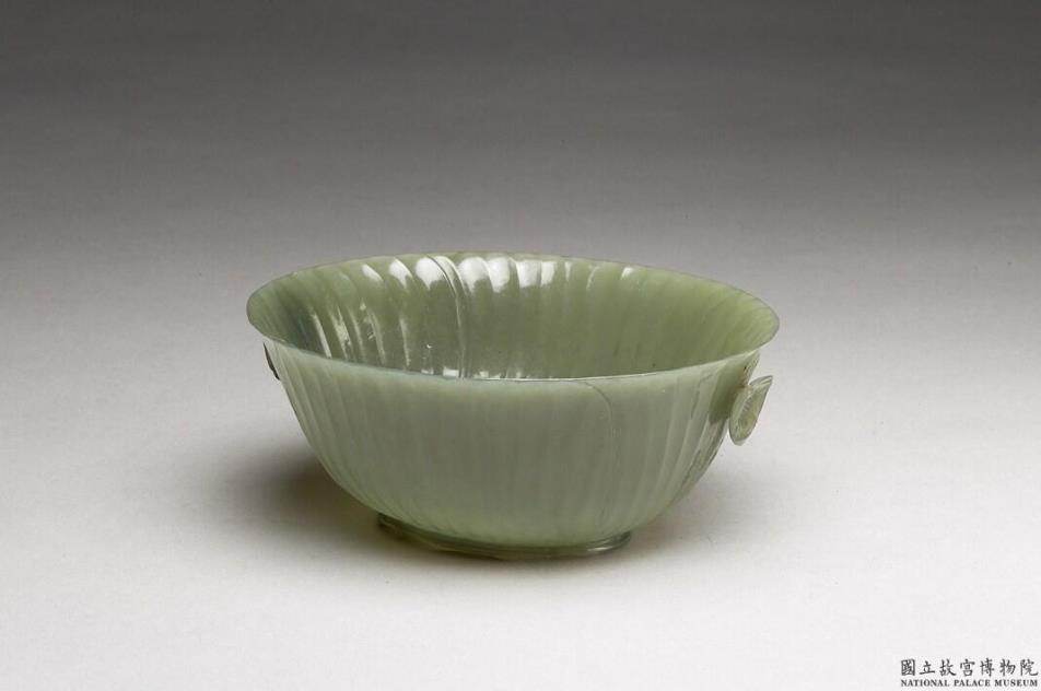 匀净温润的豆绿色玉,雕作一朵盛开的罂粟花式椭圆碗,交叉覆迭四片花瓣,每片花瓣又雕十多道密密起伏的波纹,碗口呈椭圆形;器底与两个器柄都雕作盛开的罂粟花,器柄的花朵颇小,还带有花茎与叶子,贴于碗的两侧。
