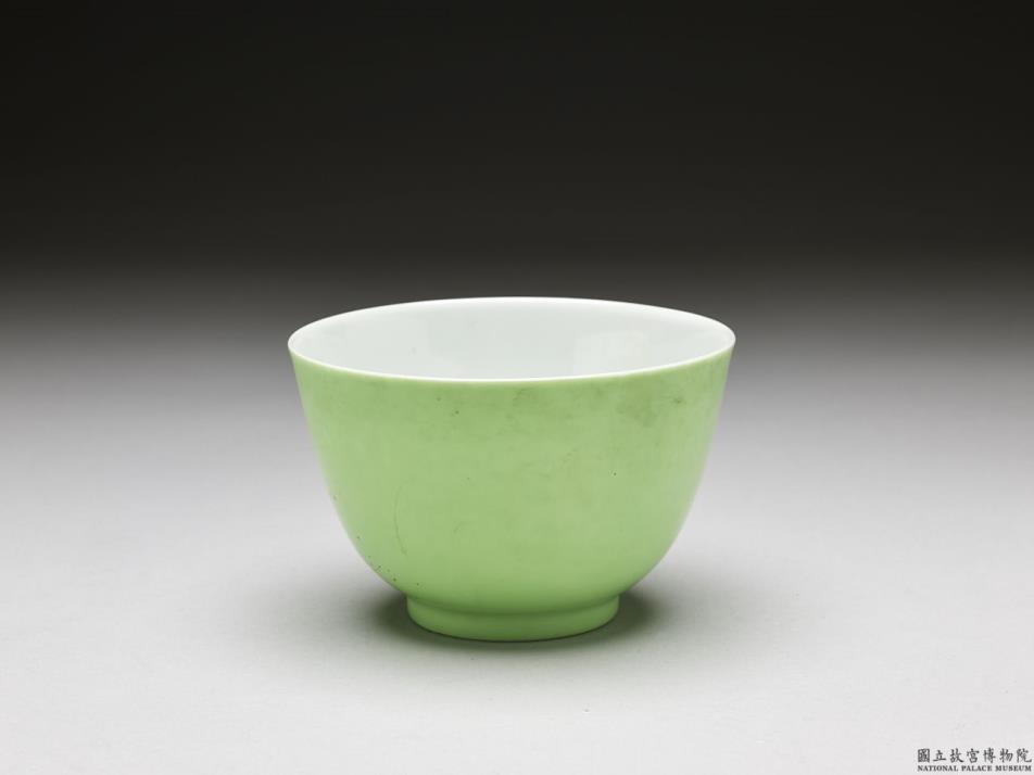 敞口,直弧壁,矮圈足。器内白釉无纹,外壁施浅绿釉,釉色嫩绿淡雅,釉面满布细碎开片。底青花书「大清雍正年制」六字二行楷款,外加双方框。一般俗称此类匀净淡绿微泛黄色者为吹绿,因其以吹釉技法制成而得名。吹绿色是雍正朝低温珐琅绿釉的代表釉色,多见于小品器类。由于釉色较难控制,故本院所藏数十件吹绿、翡翠釉杯,几乎件件皆有色差,有的偏绿、有的偏黄。此类尺寸为小号茶圆,亦称茶杯,雍正《活计文件》记载宫廷烧制有大号与小号磁茶圆之分,口径10公分者为大号茶圆。此杯清室善后委员会点交清册品名为「雍正款松石绿茶杯」,有撇口、及敞直口等数种。