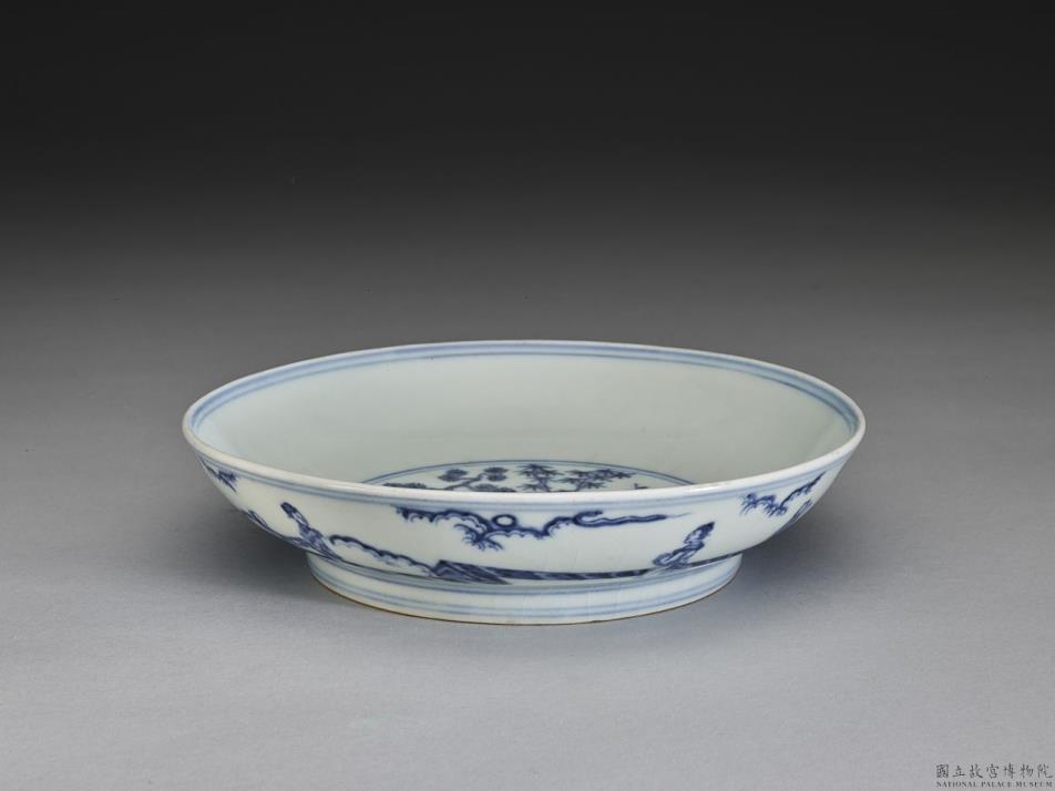 侈圆口,浅弧壁,矮圈足。盘心绘松、竹、梅岁寒三友,加饰湖石、兰草、灵芝,外围青线二道。外壁纹饰描绘花园湖石牡丹、棕榈,八仕女游憩其间,二人一组。四组仕女动向依序为:一仕女由侍女所持水盘洁手回首后顾;一仕女坐看明月,侍女执扇后立;一仕女拈花欣赏园景,侍女则捧瓶花随后;另一仕女比手指引侍女浇花。口足间加饰青线八道。青花釉色灰青,其上透明釉层较厚,略带铁锈疵斑,白釉泛青。釉面细小气泡密布,并有稀疏直线开片纹。胎骨微厚略重,底微凸,质坚细腻。盘底青花书「大明宣德年制」二行六字楷款,外加双圈。此类园林仕女图,宣德器上用之甚频,本院所藏另有侈口碗,其他尚见于撇口碗及高足碗之上,宣德官窑一元多式的特征─同纹饰不同器形又可由此概知。