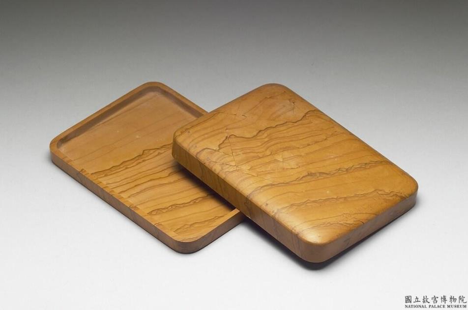 土黄色方形砚盒,通体有黄、褐色天然横纹,似层层相迭之水波纹。盒背周缘起宽棱,并有一层褐黄色涂料。盒盖有璺与破补。