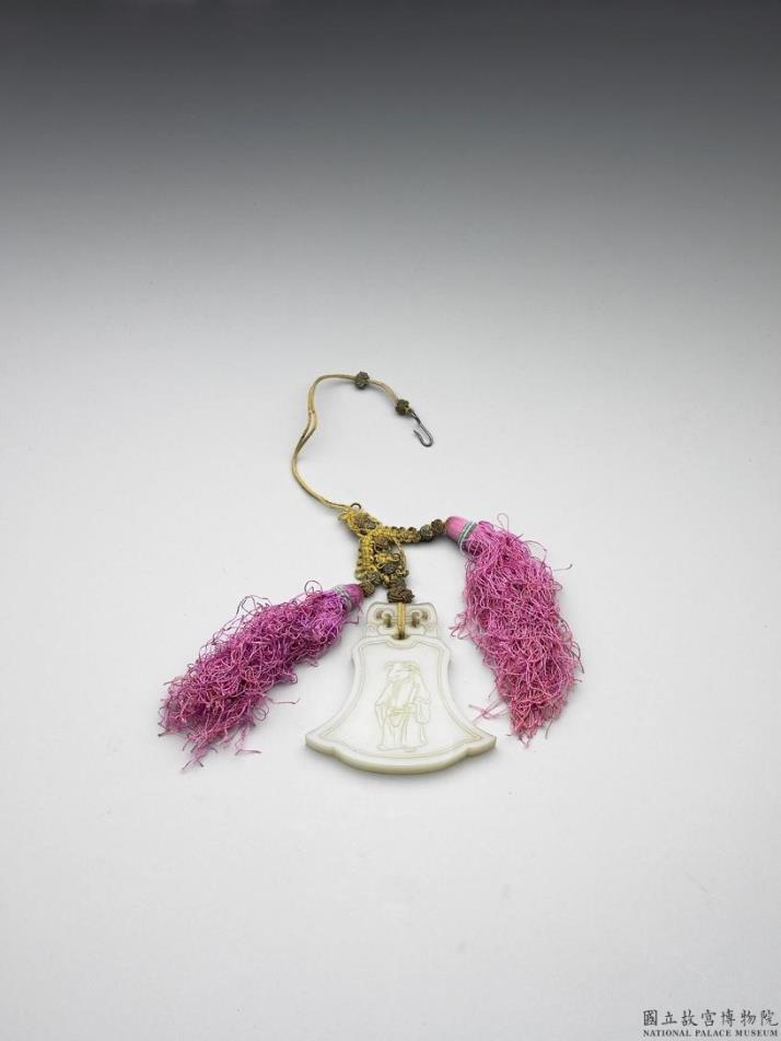 白玉斧形玉佩,为十二生肖玉佩组之一部份(共15件),可共组成一圆形。玉佩一面雕篆书「未」字,一面为羊首人身像,右手握腰环,左手持笏。有镂空钮、带丝穗。