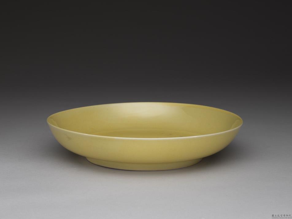 侈口,浅壁弧形,矮圈足。胎质较薄,内外满施娇黄釉,盘底纯白,朴素无纹饰。底均有青花书「大明弘治年制」六楷字款,外加双圈。