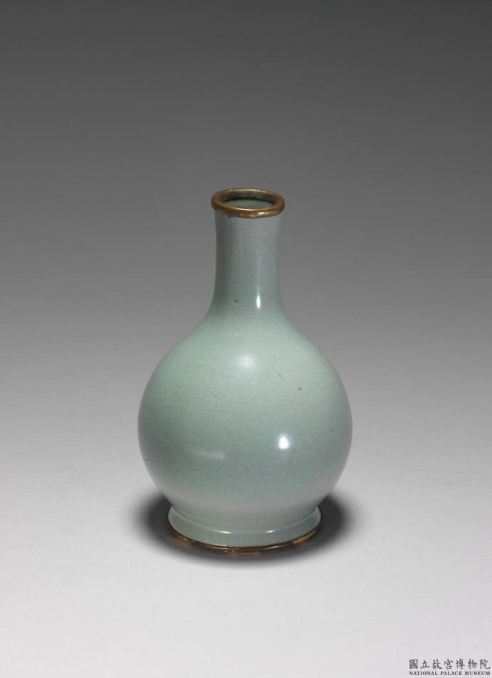 圆口嵌铜扣,细颈,圆硕腹,圈足外撇加嵌铜边。通体施天青色釉,釉质匀润,釉面满布灰色开片,局部微现粉色光泽。底心刮去釉层,形成一无釉圆面,加涂黄色薄汁。沿边镌刻乾隆皇帝〈咏官窑温壶〉御制诗,内容为:「通体纯青缬细纹,用圜旅食古攸闻。难为兄固有其事,生二精陶实出群」。句末署「乾隆乙未春御题」(乾隆四十年,1775)纪年款识,并钤「太璞」一印。 乾隆皇帝在这首诗中,表达出他将汝窑胆瓶看成是章生二窑,通过诗注的解说也得知此一信息主要来自明人陆深《春风堂随笔》的记载,也就是章生一和章生二两兄弟各自主持一个窑厂烧造瓷器,章生二窑的成品质佳近于「官窑」,在他笔下遂胜过章生一窑。 对照河南省宝丰县清凉寺窑址出土的标本,以及大英博物馆的汝窑长颈瓶,从互为相似的颈腹、圈足中,得以推想此件作品原来亦具喇叭口长颈的造型特征。