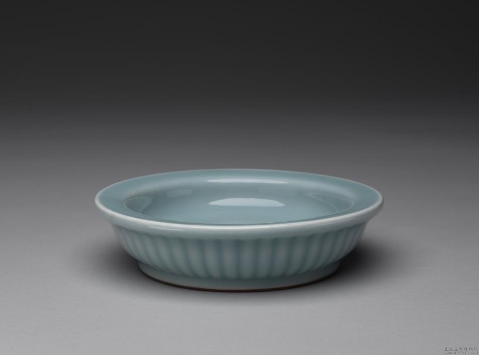 敛口宽唇,周壁低浅,平底,矮圈足。胎骨厚重,通体满施天青釉。足底露胎,涂有淡赭色汁。底有青花书「雍正年制」四篆字款。