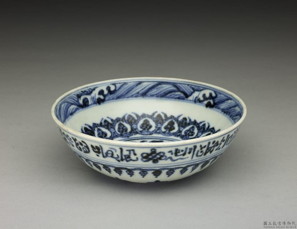 侈口、圆弧璧、凸底、浅圈足,碗心向内凸起。内壁画波涛纹、桃形勾连图案及转枝花卉各一周,碗心画桃形几何形案。器外壁口沿下书波斯文一周,中间以方胜三枚断开,壁上另画几何边饰二周及转枝菊花一周。口沿下书写之波斯文,可能是不识波斯文字的陶工的摹写之作,字迹尚难辨识。在器物口沿下书写或刻划一圈文字,并以花朵等装饰纹饰隔开字句,在伊斯兰玉器及金属器碗类器皿上可以见到类似的做法,推测小碗有其模仿渊源。