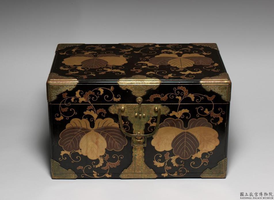 清宫档案登录为「黑漆描金箱」的箱盒,有些是指日本莳绘漆箱。它们通常以黑漆为底,彩绘纹样后再配合纹样撒上金、银粉末,最后加工研制而成。十六世纪下半叶之后,随着国际贸易网络的开展,莳绘漆箱逐渐营销全世界。不管是不是直接受到明末鉴赏家的启发,清朝康熙(1662-1722)、雍正(1723-1735)和乾隆(1736-1795)三位皇帝经常使用这类漆盒收存各式珍奇宝贝。如此件漆箱,器表装饰着日人称为「茑纹」的叶形图案,里面可以容纳十九个木匣,最初是为了收纳七十四件小瓷杯而设计,目前留存其中六十七件。