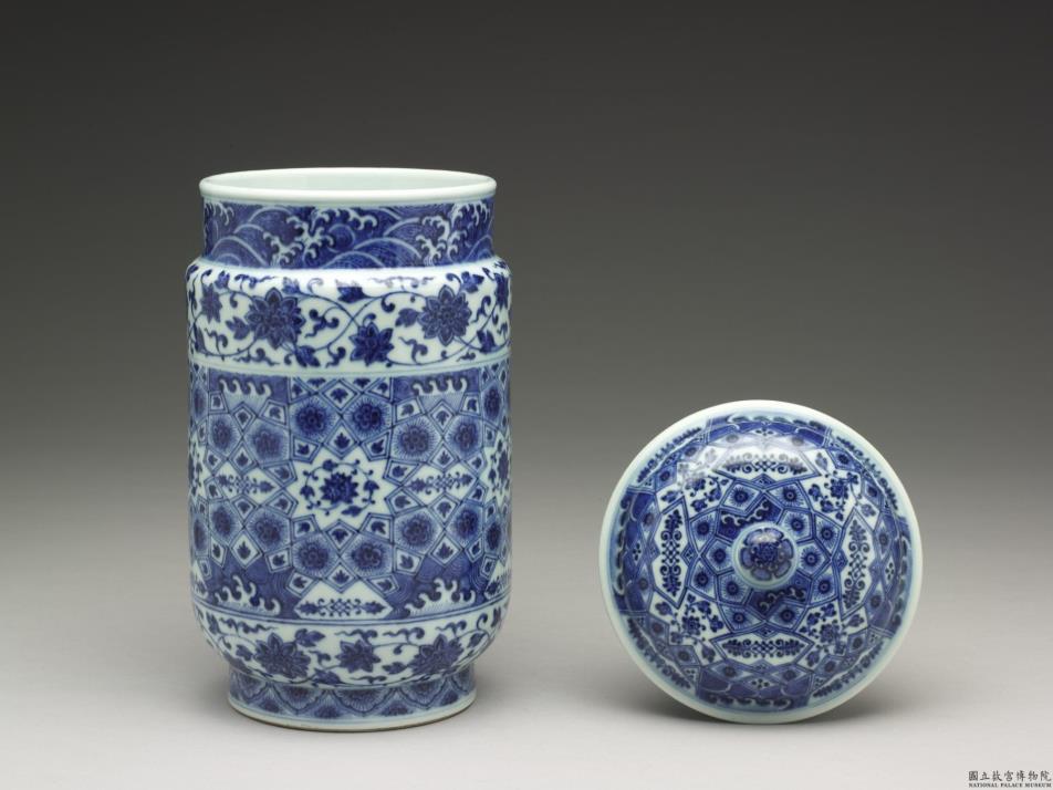 敛口,短颈,长腹,矮圈足,带圆顶盖。胎质较厚,通体白釉。颈上青花书波涛纹。腹部中段画锦格纹,加画番莲、波涛等纹饰,上下分画缠枝番莲花。足画云头纹,加饰花瓣。盖面满画锦格纹,加画番莲波涛等纹饰。