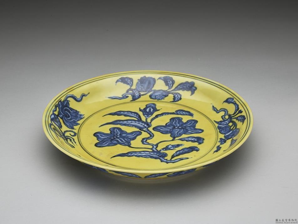 黄釉青花花果盘