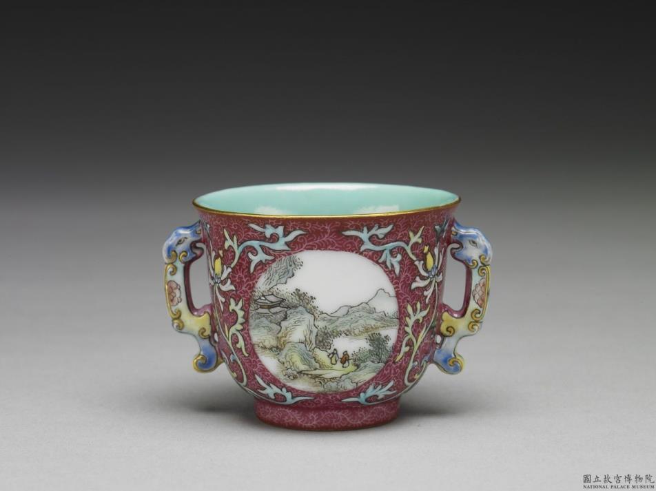 杯,口微撇,深腹,双龙耳,圈足。外壁及圈足均为红地锥剔凤尾形卷草锦地纹,二开光内绘山水人物画,开光两侧勾绘图案式洋花。口足缘均描金彩,内壁及外底施湖绿釉,外底心白地框内有青花书「乾隆年制」四字二行篆款。