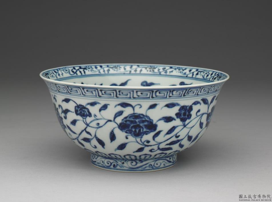 侈口窄唇,深壁,矮圈足。薄胎白泑。口唇上画转枝小菊花一周,内壁画缠枝牡丹、菊花等五朵,碗心画番莲一枝。外面口缘下画回纹,周壁画缠枝番莲五朵,底边画莲瓣纹,足圈画勾云纹。内外花纹间加饰青线十道。