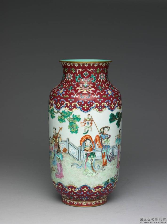 长形花瓶,撇口、宽肩、直筒腹、圈足,有如直筒的灯笼。底书「大清乾隆年制」六字朱红篆款。器上下各为紫红地番莲花锦﹔直筒状腹部则为人物开光,绘一群十二个女子在庭园中乐舞的情景。女子皆着云肩、披帛及纹饰细腻的锦服。以双袖高举而屈身踏舞的女子为中心,身后站立戴帽女子手上执根如意首长竿,竿头垂挂结有鱼与磬的流苏长穗。旁侧站立八个女子,右五左三,正演奏乐器,有吹箫、笛、笙者;有击响板、班鼓、小钹、云锣者;有弹三弦者;另有二女子作谈笑前来状。众奏乐女子围着舞者的开光图像,与乾隆六年(1741)孙祜、周鲲、丁观鹏的《院本汉宫春晓图卷》相似,该图舞者,一袖高举,一袖向下挥去,屈膝跳踏的动感十足。而乐者的吹奏皆管乐器与敲击乐器,施施而来二人亦手提乐器。此瓶则奏乐者有弦乐器加入,举旗指挥者改为提吉祥灯饰,添增庆贺气息。该图用色浓丽,与本瓶粉彩浓厚的的情况相似。