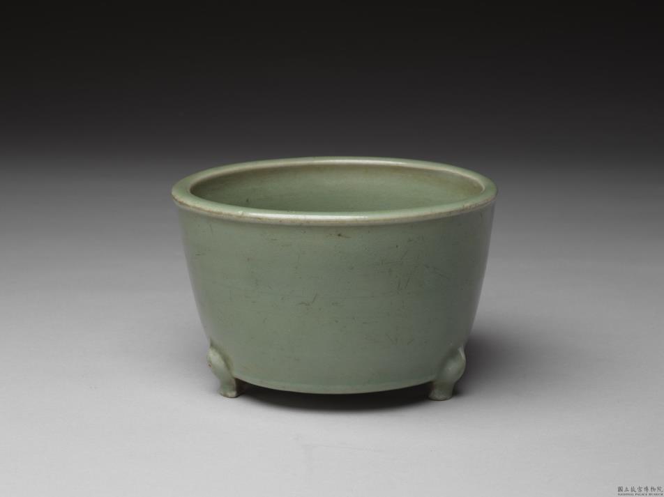 直口、深直壁、三足。全器朴素无纹饰,施罩翠青色釉。三足足底无釉,露出浅灰色胎。外底旋挖一圈,此圈无釉而呈褐色,原来烧窑时作为垫烧之用。器内也有一圆块,呈褐色,无釉,估计原为垫烧痕,也就是说满窑时器内可以再装进一件较小的柸件。
