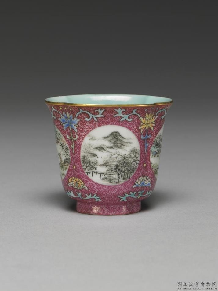 杯撇口,深腹,圈足。外壁及圈足均为紫红地锥剔凤尾形卷草锦地纹,余隙二圆形开光内,分别以墨彩及彩绘画四季山水画,开光之间钩绘图案式洋花。口足描金,杯内及底施湖绿釉,底心白地框内青花书「乾隆年制」四字二行篆款。