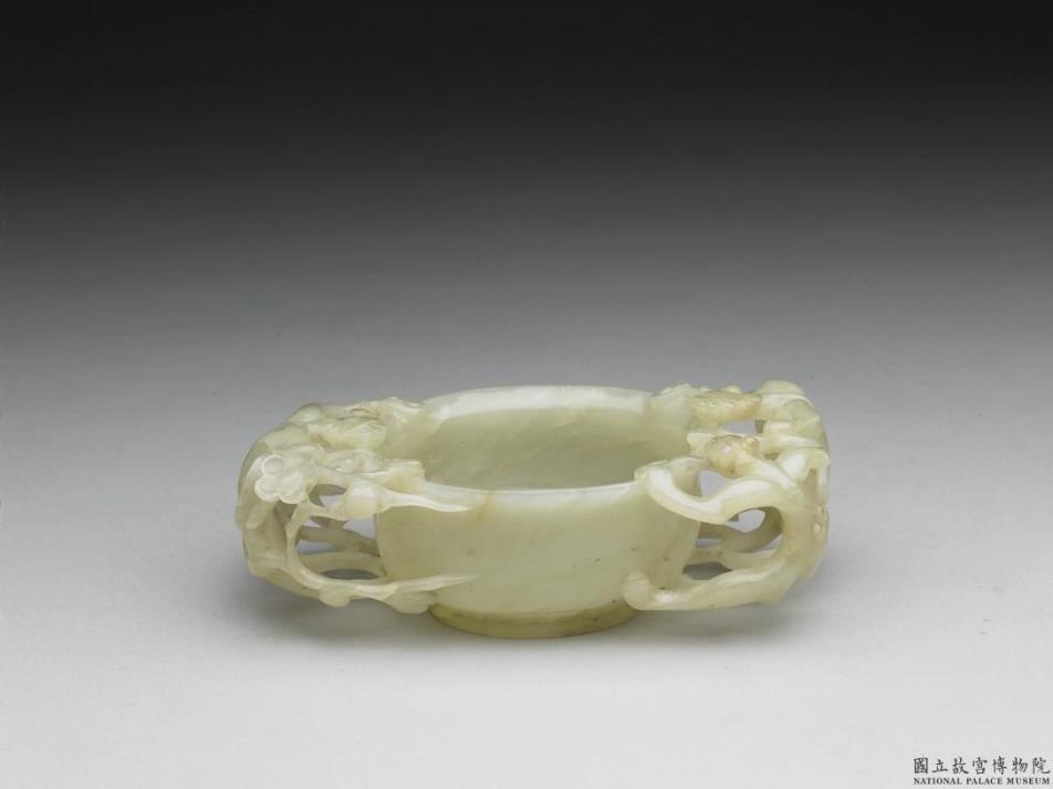 玉质。圆口、深腹、圈足。腹饰立雕三尾螭,螭口衔着口沿,盘踞于梅花松枝上。