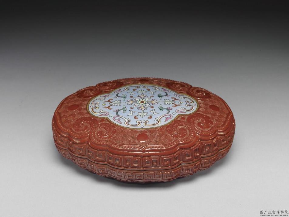 盒形似海棠花,矮圈足。胎骨厚重,釉色深红如漆。器外壁雕刻夔纹与蕉叶纹各一道。盖面刻回纹与花叶,中心开光,灰青釉地,彩画番莲花,周壁刻夔纹。器内与底均施黑色釉,朴素无纹饰。底均印有「大清乾隆年制」六篆字款。