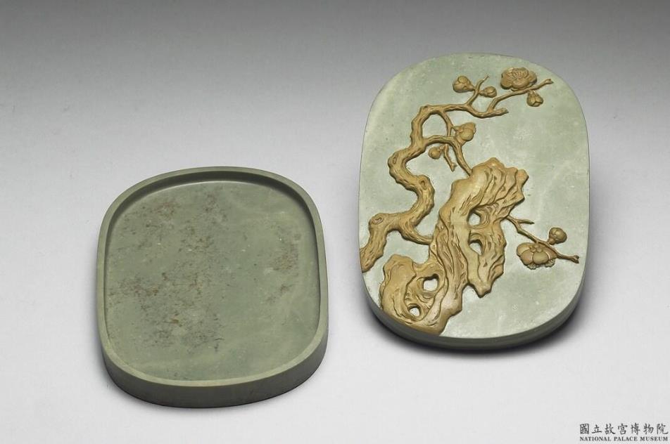 草绿色椭圆形砚盒,盒盖利用黄绿两层色石巧雕而成,盒呈草绿色,盒盖内壁有墨绿色斑,侧壁可见一层浅绿色层,似玉带,并有一块黑点密集的色斑;盒背则见黑斑与一大片土黄色斑,后者面积占盒背之一半。盖面纹饰呈绿黄色,自盖面左下角向右上方延伸,巧雕梅树与奇石,梅石各一,梅花八朵:有正,有侧,有背,有盛开,有含苞。盒背周缘起宽棱,表面并有一层褐黄色涂料。