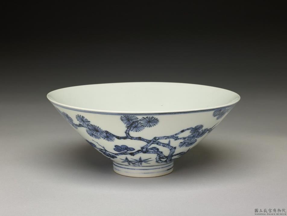 除了花卉纹饰外,永乐时期也有一类以松、竹、石等题材作为装饰的作品。这件碗敞口、斜直腹、矮圈足。器内纯白平素无纹饰,外壁以青花,画松树、竹子及梅花。松树四季长青,竹子有君子之节,梅花傲霜耐雪,所以称为「岁寒三友」,口沿及圈足各有青线两道,画面布局疏密有致。