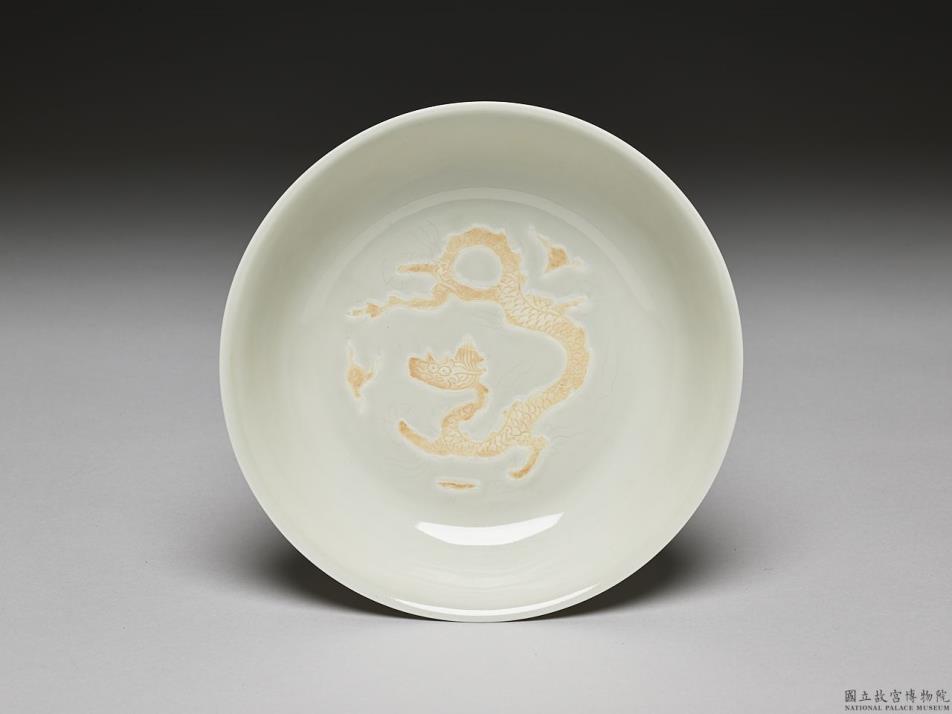 侈口,浅壁弧形,矮圈足。盘心与外壁刻画云龙三条,外壁隙地浅划波涛、山石纹。内壁纯白无纹饰。胎质稍厚,釉色甜白,龙纹均露胎,未施釉彩。底有青花书「大明弘治年制」二行六字楷款,外加双圈。