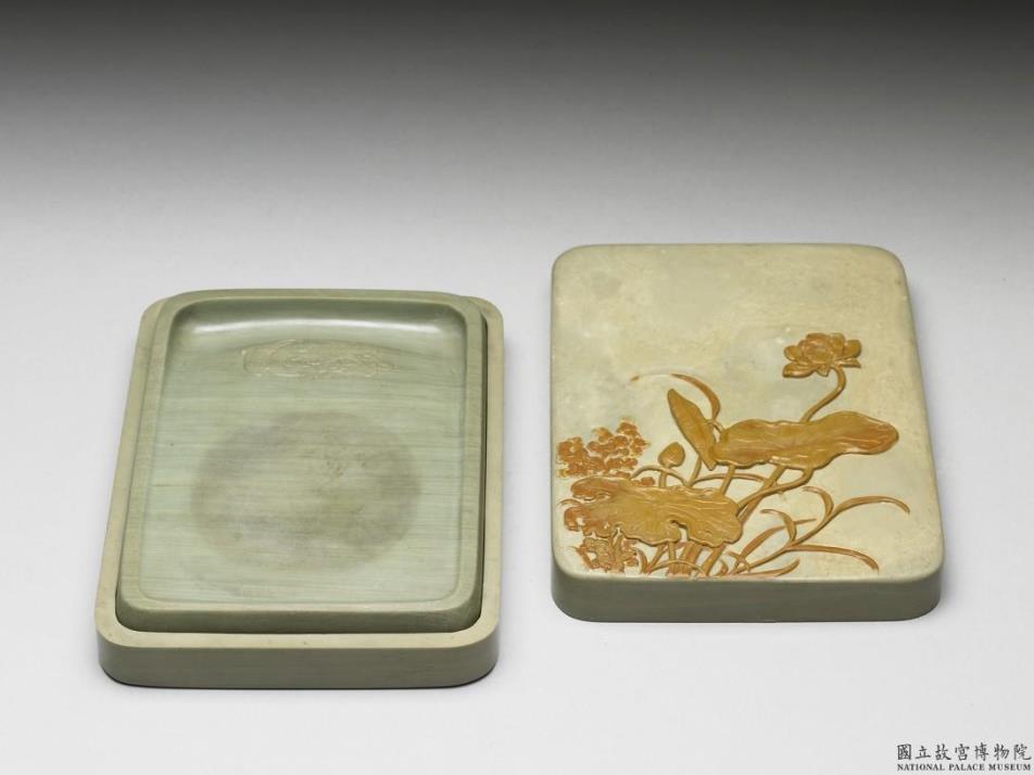 绿色方形砚,砚池下方浅浮雕一只回首凤,砚背中央处阴刻楷书铭:「出天汉,胜玉英,琢为研,纯粹精,勑几摛藻,屡省成。」款:「乾隆御铭」,并篆印:「永宝用之」。浅绿色方形砚盒,巧雕荷塘图。