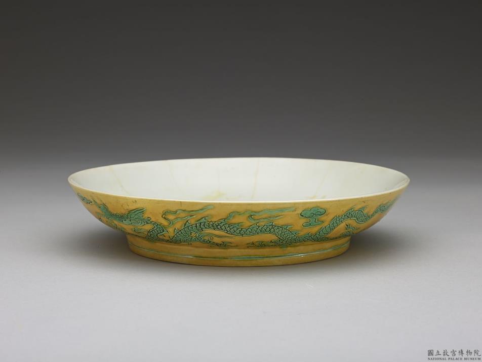 侈口,浅壁,矮圈足。外壁刻画双龙戏珠纹,足刻浅线一道。娇黄釉,花纹加填绿彩。内面纯白,朴素无纹饰。底有青花书「正德年制」二行四字楷款,外加双圈。