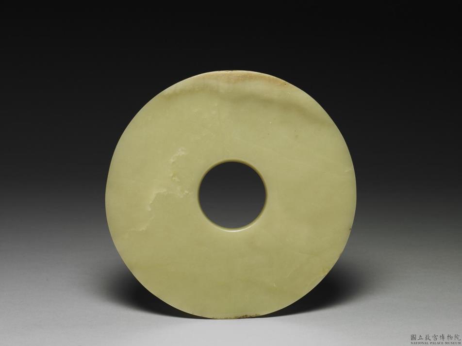 灰青带黄玉质,温润泛光泽,一端玉色变化即属糖包白玉料的规律性变化。圆璧形工整。器面最厚端与最薄端相对应,单面钻孔。