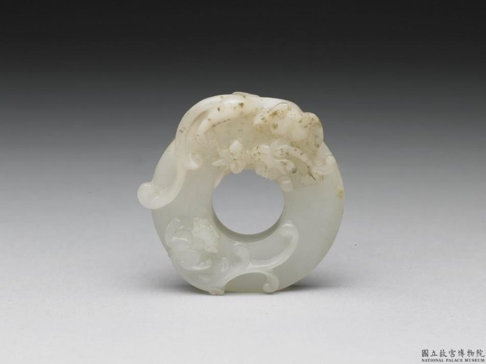 玉质。器之一面浮雕两螭曲伏璧上为饰,两螭一大一小,大者似衔压花草。另一面则琢饰乳丁纹,内外廓平整略凸。