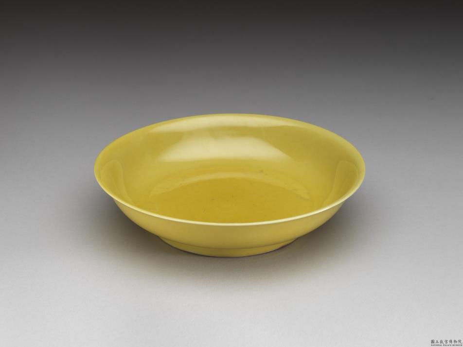 侈口,浅壁弧形,矮圈足。胎质较薄,内外满施娇黄釉,盘底纯白,朴素无纹饰。底均有青花书「大明弘治年制」六楷字款,外加双圈。