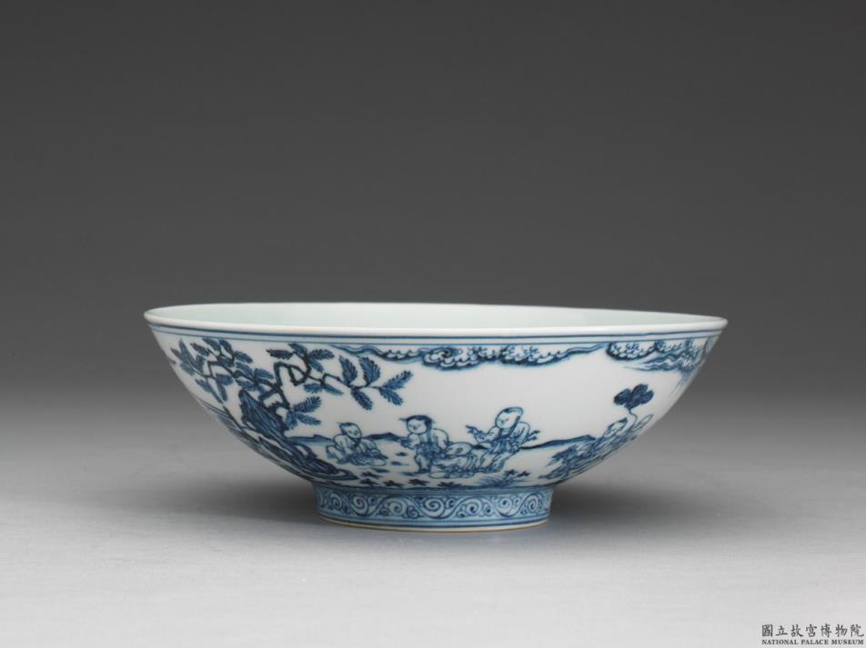 侈口,弧壁,矮圈足,底微凸。外壁绘山水、园林奇石景致,中着十六童子于庭园中嬉戏,足圈画卷草一周,口、足加饰青线六道,器内纯白无纹。胎骨较厚,青花浓艳鲜丽,微泛灰、泛紫,带细小褐绿斑、褐黄色疵斑,以及渗青斑点,围栏线条和轮廓线之渗青斑点尤甚。白釉微泛青色。胎骨匀称,外底微凸,质白细腻。器底书「大明宣德年制」二行六字楷款,外加双圈。青花瓷器,使用庭园婴戏图,由永乐至万历,终有明一代兴盛不衰,且各时代皆有其青料、或画风上的特征,惟永乐、宣德较难区别,尤其无款者为甚。宣德婴戏图系出自永乐画稿,此十六童子嬉戏图,通常三三两两,各乐其乐,其中有浴佛者、骑木马、擎荷叶者、亦有于缸中捞鱼者、有坐地玩耍者,不一而足。此图坐地玩耍者四人当中背对者其头部轮廓线之渗青斑,至为清楚。