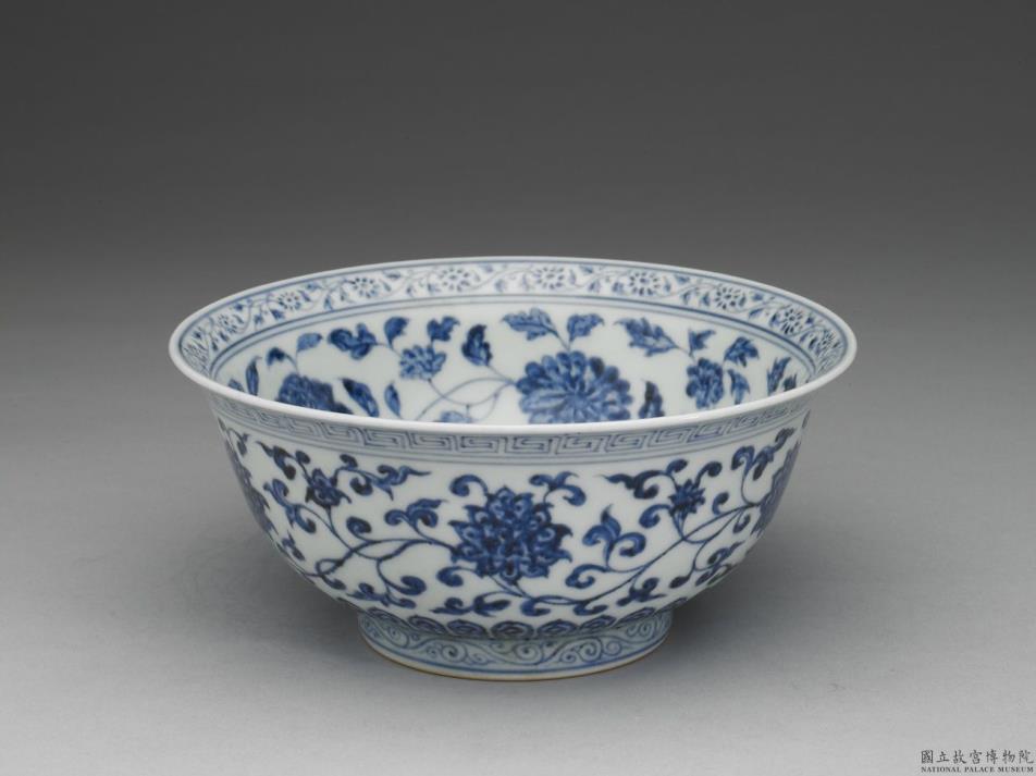 撇口碗,窄唇,深弧壁,矮圈足。碗内口沿画青花转枝菊花,内壁画缠枝四季花五朵,碗心有青花双圈,内画番莲一枝;外口沿回纹一道,外壁饰缠枝番莲五朵。底边为莲瓣纹,足壁画钩云纹。内外纹饰间加饰青花弦纹共九道。外底心书「大明宣德年制」青花双行双圈楷书款。