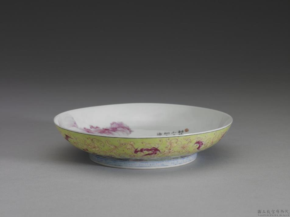 敞口,浅弧壁,矮圈足。器内壁以红料在白釉地上绘饰山水景观,在树石山景间点缀房舍,空白处以墨书题句:「树接南山近,烟含北渚遥。」诗句前后以朱红描绘「寿如」、「山高」、「水长」三印,三印章法不尽相同。外壁以浅黄绿釉为地,彩画灵芝、蝙蝠及缠枝花卉,下饰波涛、山石等吉祥图案,外壁图案上下各有黑线一道。圈足内外施白釉,足外墙画蓝料回纹一圈。器外底有「乾隆年制」四字双行双方框青花宋体楷书款。乾隆朝瓷胎画珐琅承袭雍正朝样式,依花卉、山水类别题诗、钤印,诗文则多引用唐宋或明代名诗,本件诗句引自唐代李峤诗作。本件与故瓷13988形制、大小、款识相同,纹饰极相似,但碟内红料山水布局略呈左右相反,故瓷13988有人物,本件则无;外壁纹饰细节亦略异。