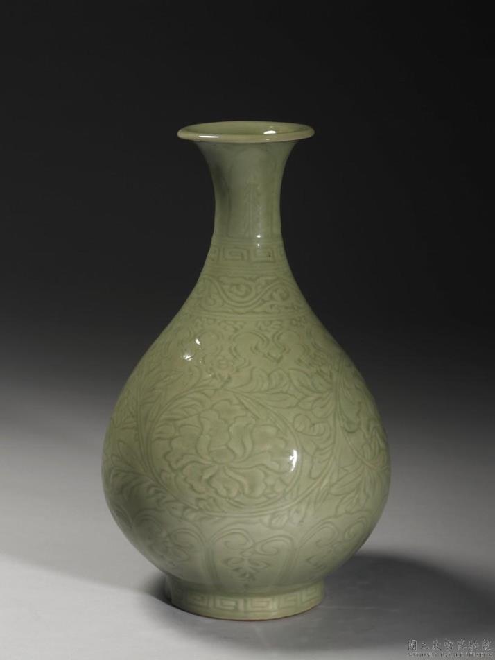 玉壶春式瓶,撇口、细颈、梨形硕大圆腹、圈足。外壁以带状划花为饰,从口、颈至足部,最上层为蕉叶纹,下接颈部的回纹、转枝叶纹;腹部上端为如意云肩纹,腹部主体为缠枝花卉纹,主花四朵,纹饰工整,枝蔓花叶满布空间。下腹部为门字莲瓣纹。足壁刻回纹。圈足无釉,呈朱褐色。院藏此式花纹中,以此件用刀最为工致,也与安徽永乐十二年(1414)平江伯陈闻墓的玉壶春瓶最相近。