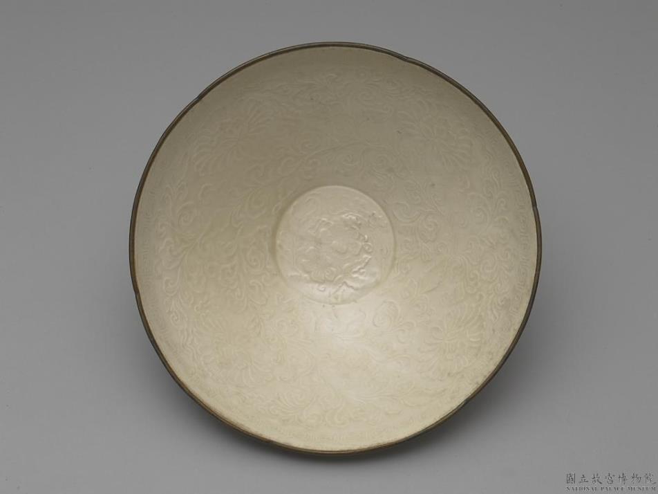 侈口、深壁、圆底,矮圈足。口沿镶铜扣。全器满施米白色釉,釉色微泛黄釉质匀净。器外壁光素无纹,并可见到釉汁流淌所造成的「泪痕」。器内口沿下印回纹一道,周壁印缠枝牡丹,底心印梅花。而因为此碗圈足并未露胎,同时口沿也可见芒口痕迹,故可推测烧造时应采用覆烧技法。覆烧技法于北宋末年定窑普遍使用,一改过去只能用匣钵仰烧或支钉迭烧等技法,使瓷器烧造时可以节省不少空间,也可防止器物变形。口沿镶铜扣亦为定窑重要特色之一,除了可遮掩覆烧时产生的芒口外,亦结合了当时人们对于金银器饰的喜爱。