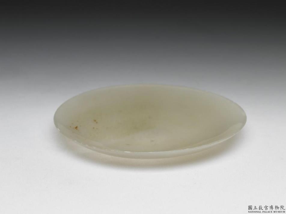 黄灰色玉。颇莹透。琢一小浅碟器身小巧,底心有一径约2.5公分的凹陷,正中央还有一径约0.75公分,用阴线刻成的小圆圈,可能是使用圆规刻成,所以圆心处有小凹点。