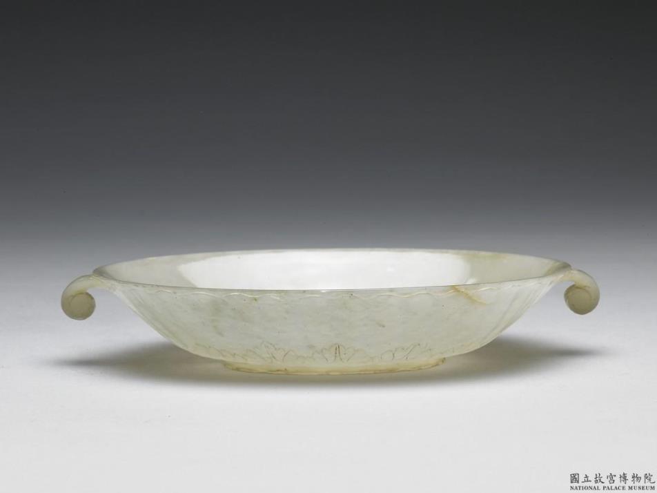 玉质,琢作一撇口浅腹的椭圆碗,碗底雕琢一平展的罂粟花,交叉覆迭四片花瓣,中央又琢一平展的莲花。周围绕一圈莨苕叶。自两侧下方沿着腹壁向上伸长莨苕叶至口沿处,叶尖卷折成器柄。