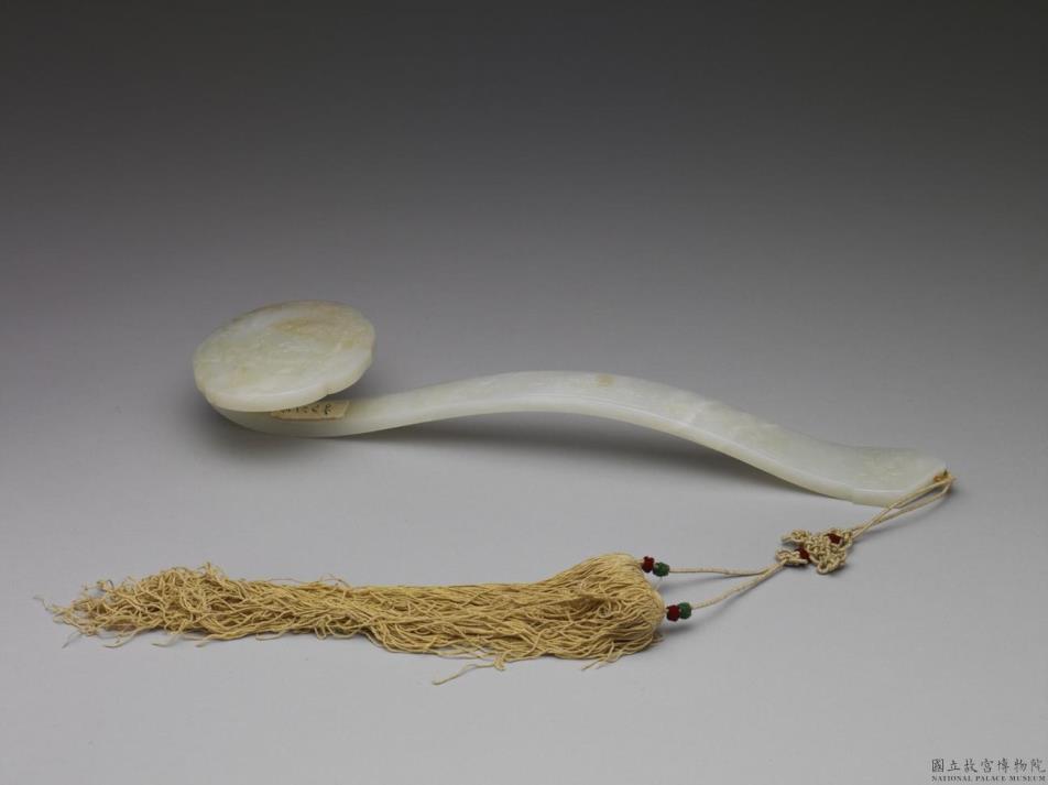 玉作羊脂色,唯首面右下方微透淡红,柄正面中央弧凸处浮雕「吉祥如意」篆文四字,上下皆有蝙蝠浮雕,寓「福寿」之意,上方蝙蝠衔寿桃下飞;下方衔水仙花作上飞之姿。首面浮雕「仙人采药图」,苍松寿石中有二仙人,一仙荷锄并肩负一药篮,一仙手执如意作回首交谈状。柄之反面浮雕祥云。柄尾附黄色双穗。