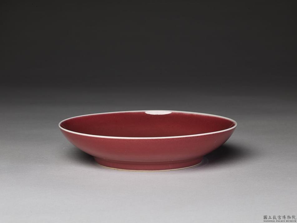 侈口,浅壁弧形,矮圈足。盘心浅划云纹三朵,薄胎质,内外满施霁红釉,盘底纯白,口沿露白边。底有青花书「大明宣德年制」六字二行楷款,外加双圈。