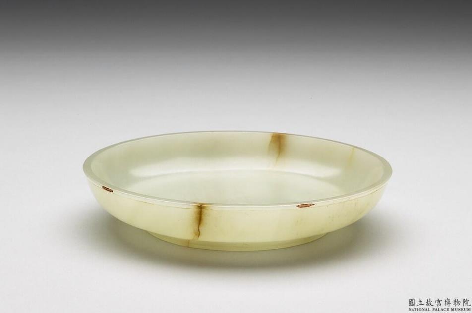 玉质,口沿处有赭色裂璺。直口、弧形壁,有圈足。器底圈足内有六字篆书款:「大清乾隆年制」。