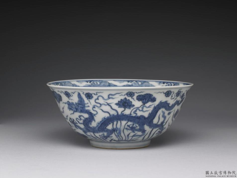 侈口有撇,深弧壁,圈足。全器施白色釉,内壁口缘绘波涛纹一圈,碗心与外壁皆绘河塘莲丛,中有行龙穿梭,龙圆睛竖发,身周有火焰纹。器底有青花「大明弘治年制」二行六字楷款带双圈。弘治青花传世不多,但水平颇高,本件以平等青料为主,特色几与成化同,故有「成、弘不分」之说。弘治青花特征较成化纤柔,构图疏朗,轻描淡绘。